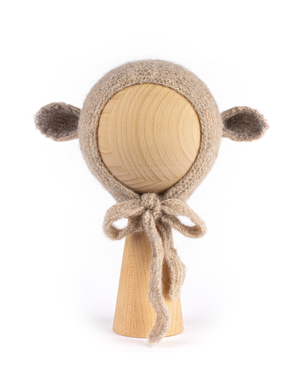 라이트 베이지 모자는 귀여운 동물 귀를 얹고 목에 묶어 안정감을 더했습니다.