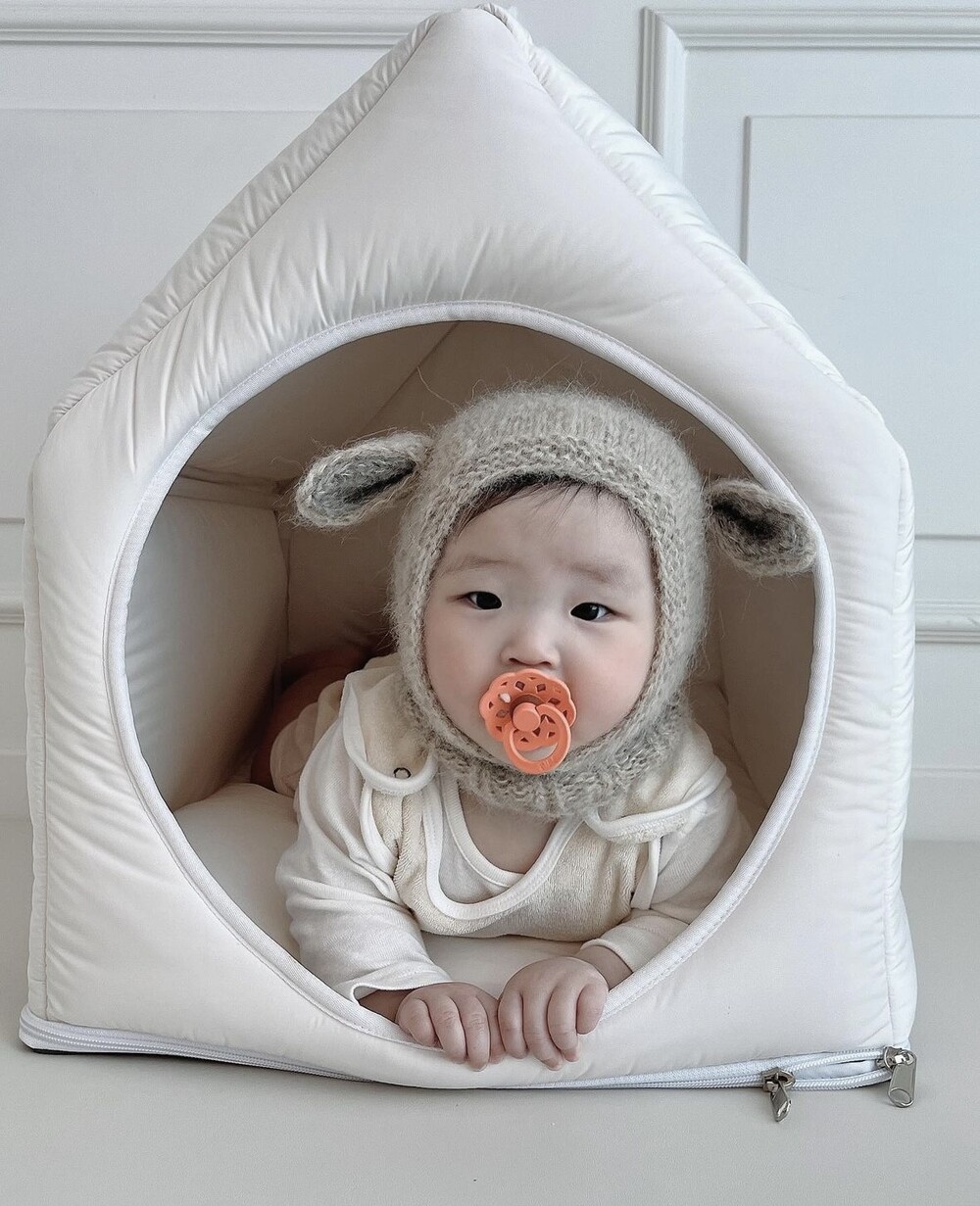 기존 모자를 대체하는 모자는 이마를 성공적으로 덮고 유아의 얼굴에 부드럽게 밀착되어