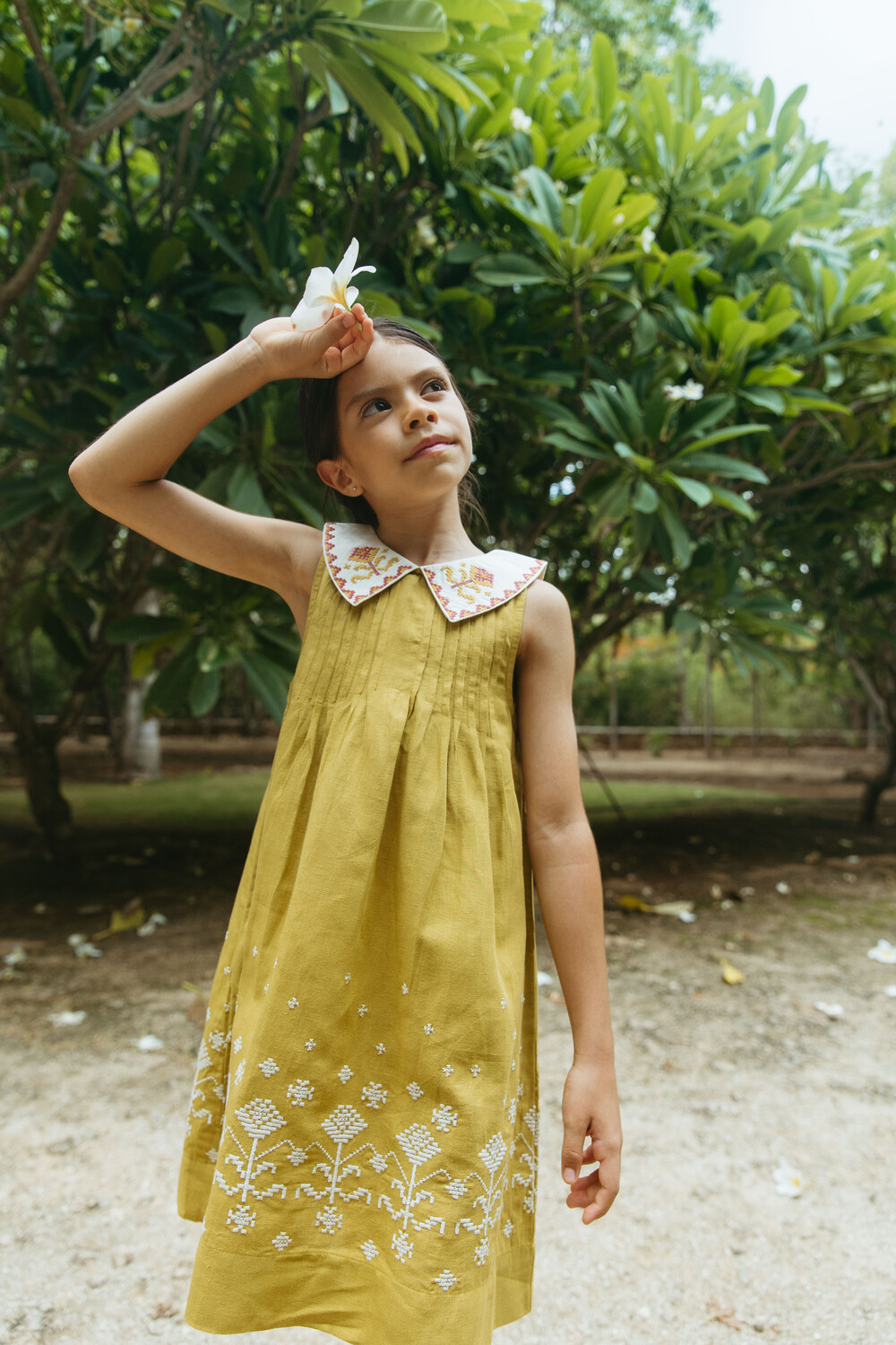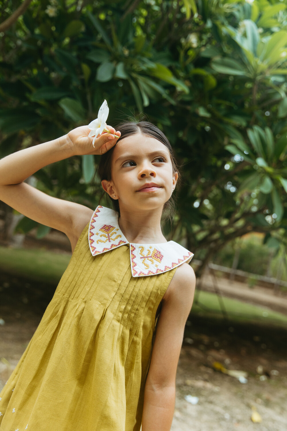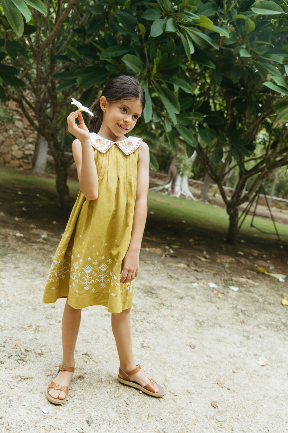 소피 드레스는 통기성이 좋은 린넨 코튼 소재로 제작된 민소매 여름 인기 아이템으로, 세련되고 착용감이 편안합니다. 가슴 부분의 섬세한 핀턱 디테일이 구조와 매력을 더하며, 우리의 맞춤형 크로스 스티치 플로럴 자수는 대비되는 칼라, 밑단, 등을 장식하여 가보 터치를 선사합니다. 측면 솔기 포켓과 뒤쪽의 부드러운 모임으로 마무리된 소피아는 따뜻한 날, 휴가, 축하 행사에 딱 맞는 충분한 놀이와 성장의 여지를 가지고 있습니다.