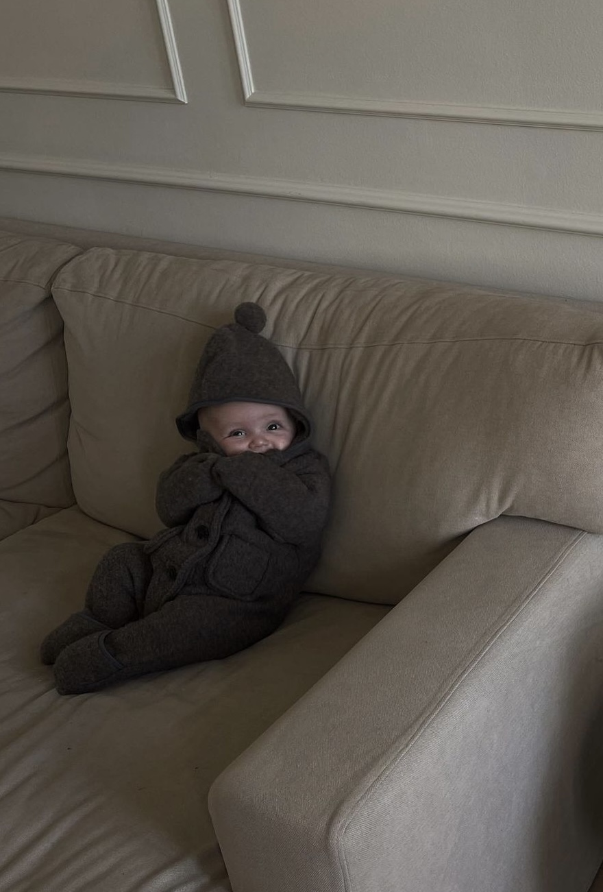 테디는 100% 메리노 울로 만든 매우 부드러운 아기 원피스입니다.