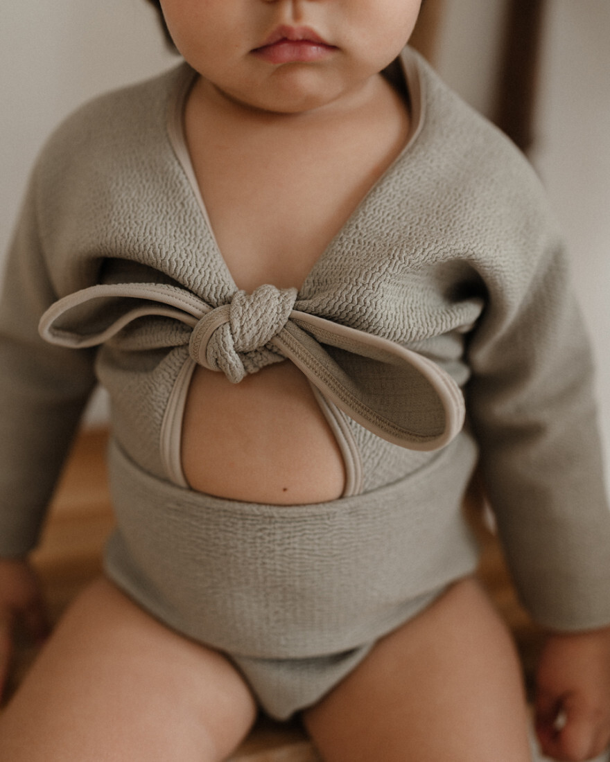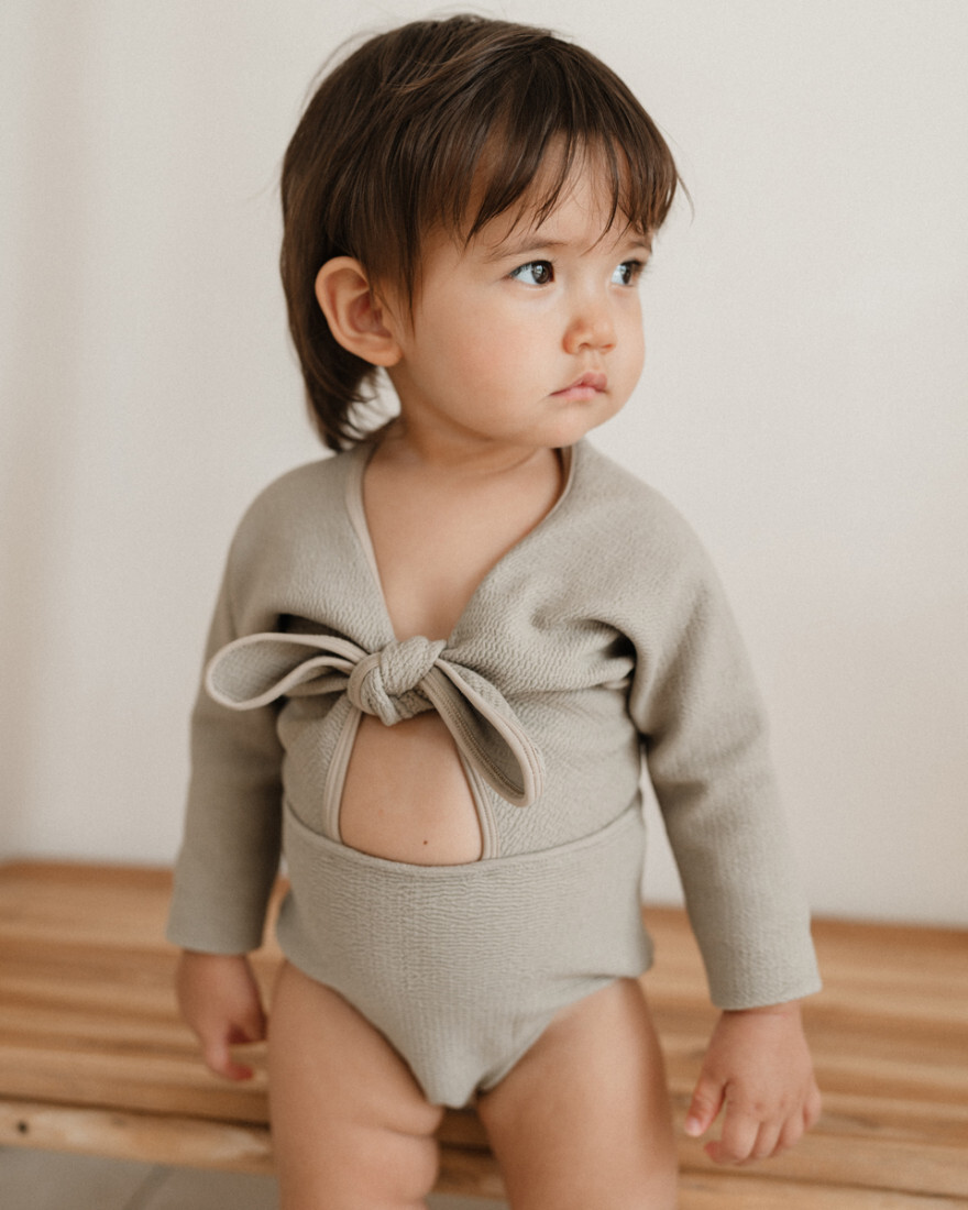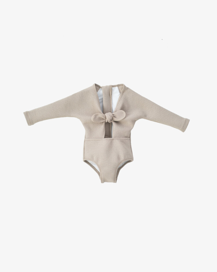 귀여운 나비넥타이와 앞부분에 삐걱거리는 디테일이 특징인 원피스 수영복입니다. 독특한 주름 소재로 제작되어 폼 피팅과 아름다운 질감의 마감을 제공합니다. 긴 소매 디자인이 아이를 햇볕으로부터 더 잘 보호해줍니다.UPF 30+나일론 92%, 스판덱스 8%풀 라이닝뒷면에 지퍼가 있습니다