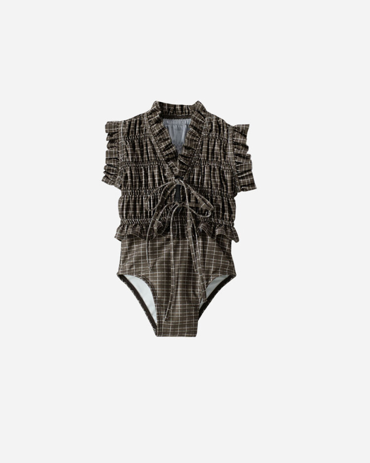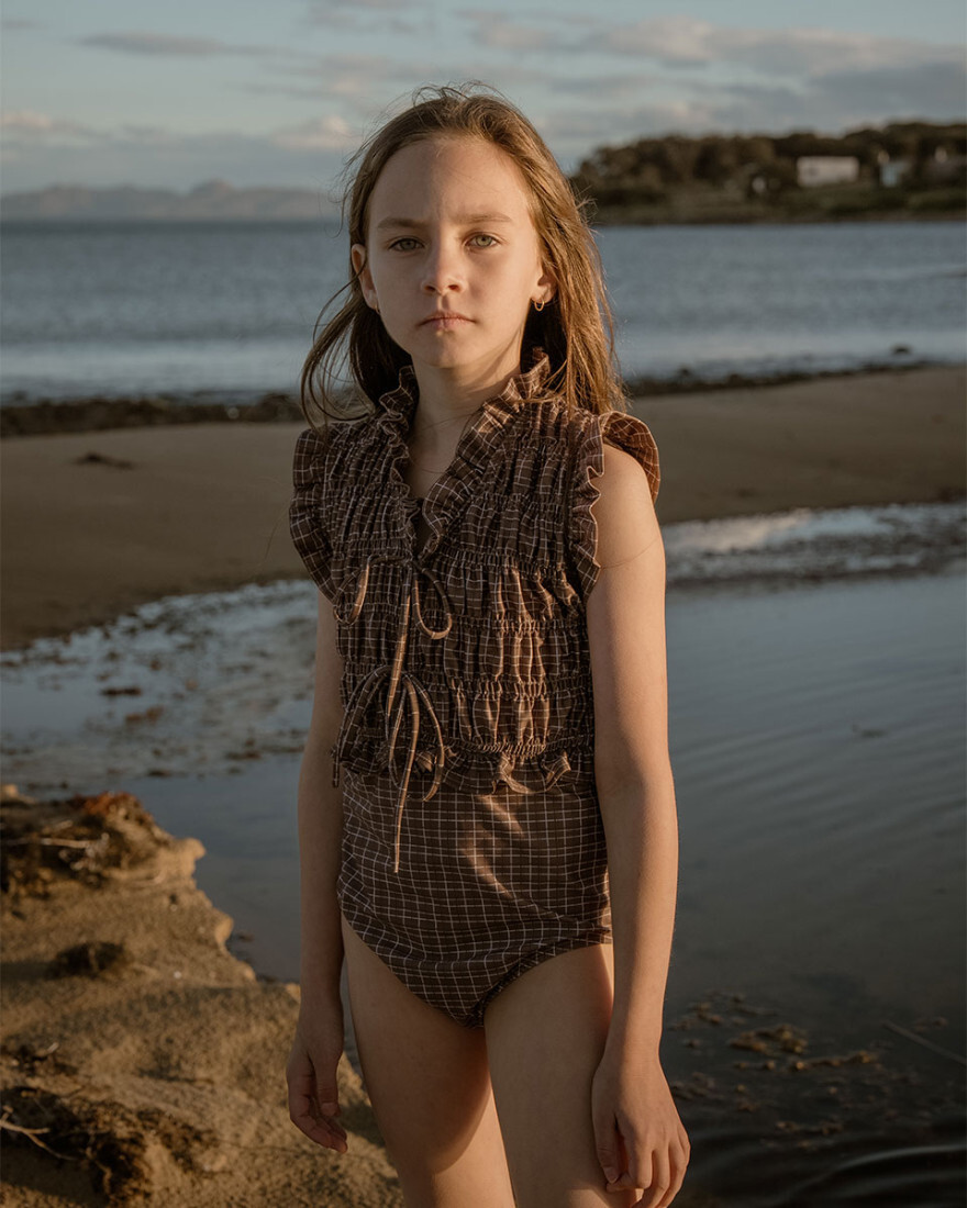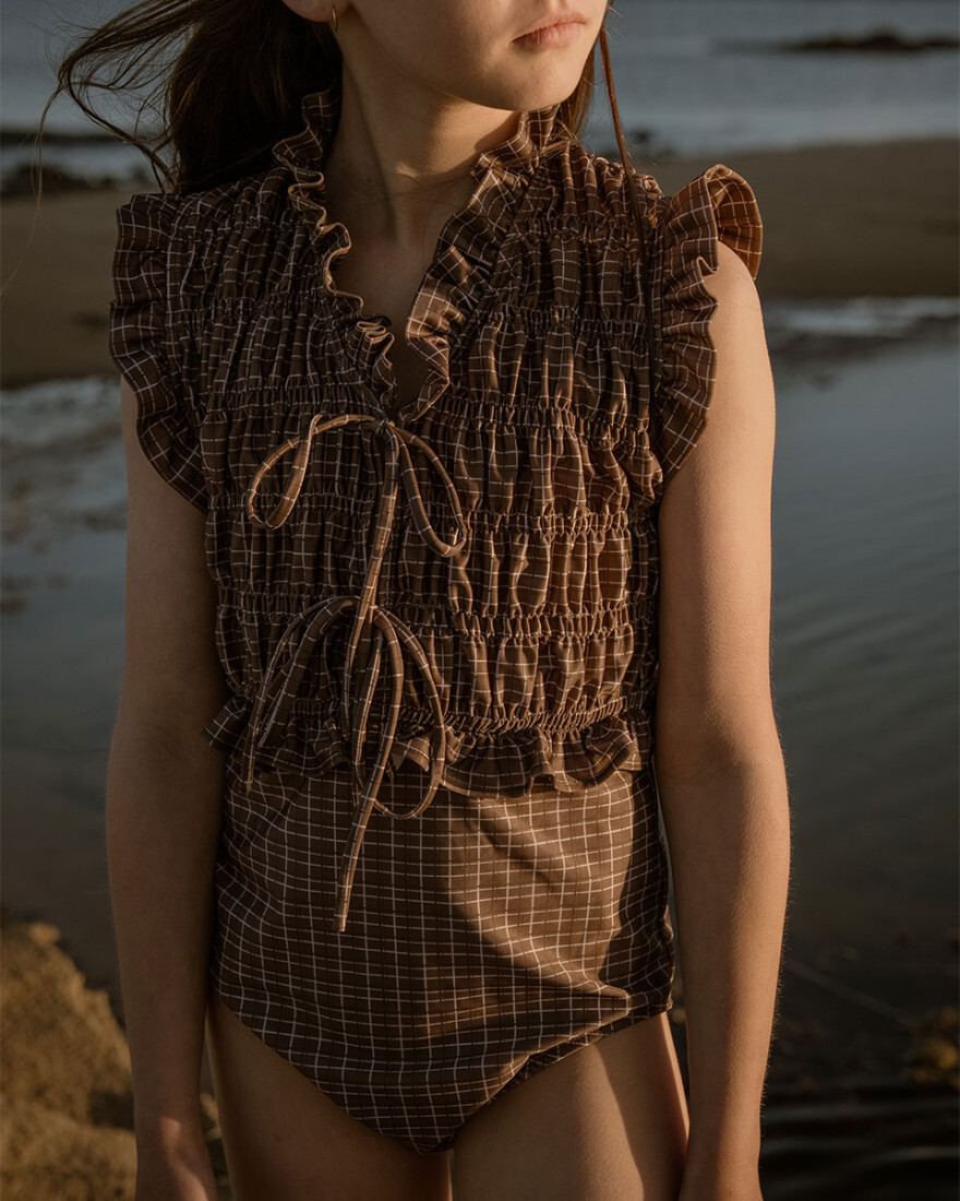 상의부터 밑단까지 달콤하게 디테일한 이 원피스 수영복은 현대적인 격자 패턴과 아름답게 스모크 처리된 질감을 결합하여 특별하면서도 편안한 느낌을 줍니다. 부드러운 러플이 어깨와 허리를 감싸 사랑스러운 실루엣을 연출하며, 앞쪽 나비넥타이는 사랑스러운 장식적인 느낌을 줍니다.현대적인 갈색 격자무늬는 재능 있는 프랑스 장인이 독점적으로 그림을 그렸습니다. 시간을 초월한 편안함과 절제된 우아함을 선사하여 해변이나 풀사이드에서 햇볕에 젖은 날에 완벽하게 어울립니다.OEKO-TEX 인증 재활용 원단으로 제작된 이 제품은 매년 매립지와 해양으로 유입되는 플라스틱 폐기물의 양을 줄이는 데 도움을 줍니다.78% 재활용 폴리아미드, 22% 탄성울타클로린 내성UPF 50+전체 안감