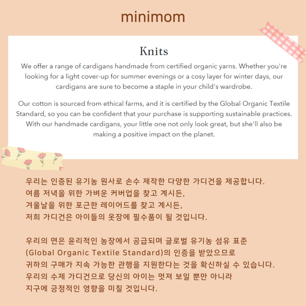 ◆ 미니맘 가디건은 오가닉 코튼 원단에 천연 염색 공정을 적용하여, 보일러 열처리를 통해 컬러를 안정적으로 구현합니다. 염색 이후 탈취 및 건조 공정을 거치지만, 공정 특성상 보일러 열처리 과정에서 발생하는 미세한 향이 일부 잔존할 수 있습니다. 이는 화학 잔여물이 아닌 공정 중 발생하는 자연스러운 현상으로, 제품 비닐을 제거한 뒤 통풍이 잘되는 곳에 두시면 수일 내 점차 소멸됩니다.
